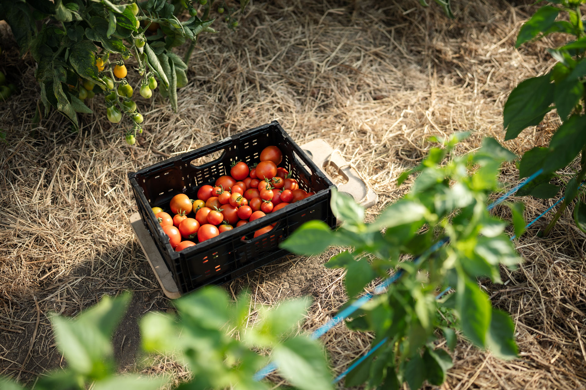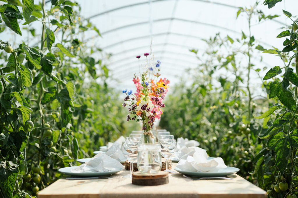Ein Tisch zwischen Tomaten, Salaten und blühenden Kräutern – so schmeckt Natur!
