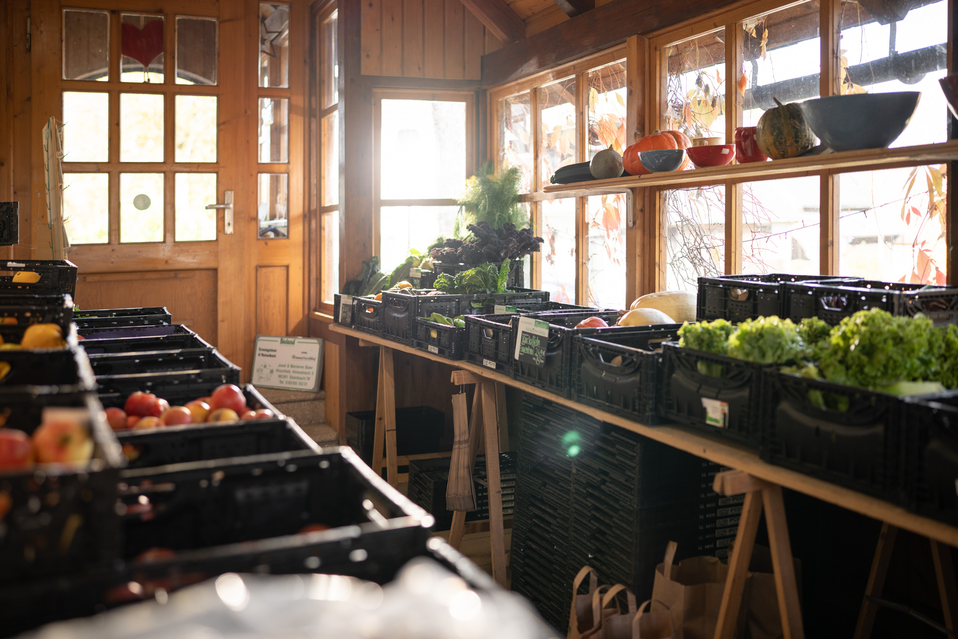 Selbst erzeugt sind unsere Obstsäfte, Honig und saisonal Gemüse. Im Gewächshaus wachsen Salate und im Sommer Tomaten, Gurken, Paprika und Auberginen. Auf dem Gemüseacker wachsen Fenchel, Kohlrabi, Brokkoli, Kartoffeln, Karotten und Rote Beete. Dazu eine Vielfalt an Wintergemüsen. So bieten wir rund ums Jahr eigenes Gemüse. Kräuter und Blumen runden unser Angebot ab.